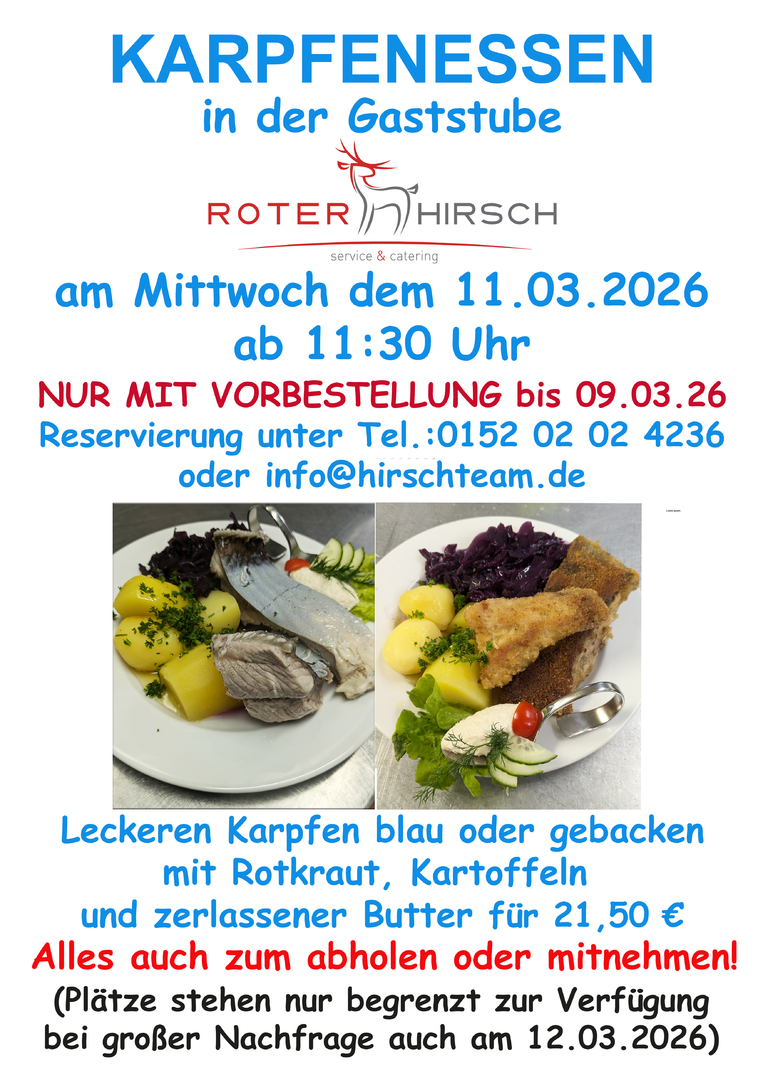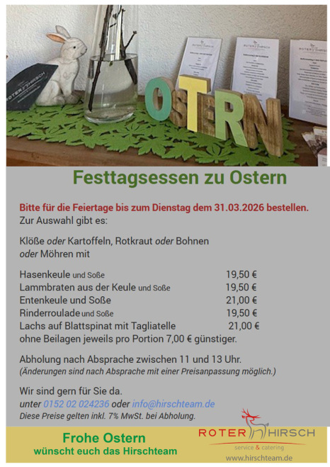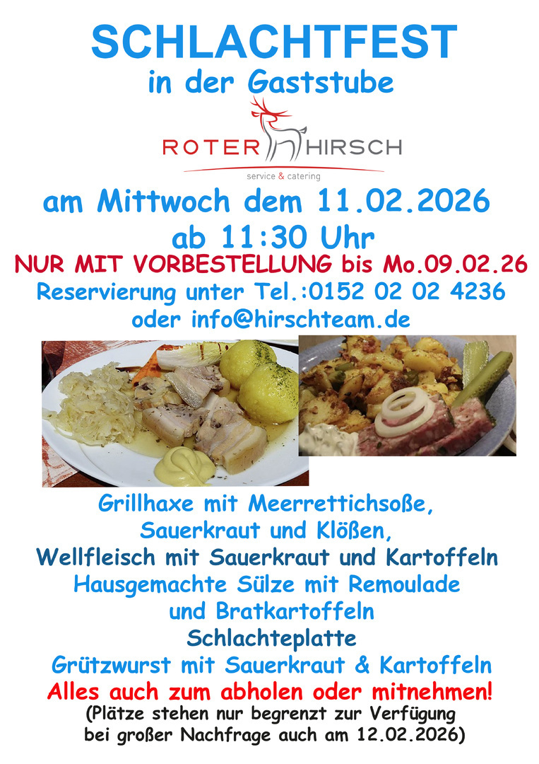 Wir sind ein Catering Unternehmen, welches 2004 gegründet wurde. Roter Hirsch service & catering bietet Ihnen Service für Buffets, Getränke, Cocktails, Equipment und Personal vor Ort. Diesen Service können Sie für Familienfeiern jeglicher Art, auch Hochzeiten, Veranstaltungen für kleine und mittelständige Unternehmen, Dorfjubiläen, Stadtfeste oder auch Sportwettkämpfe buchen. Im Haus können Sie verschiedene Räumlichkeiten mieten. Der Saal des Hauses eignet sich besonders für große Feierlichkeiten. Hier werden auch Veranstaltungen wie z. B. Silvesterfeier, Karneval oder Tanzabende angeboten.